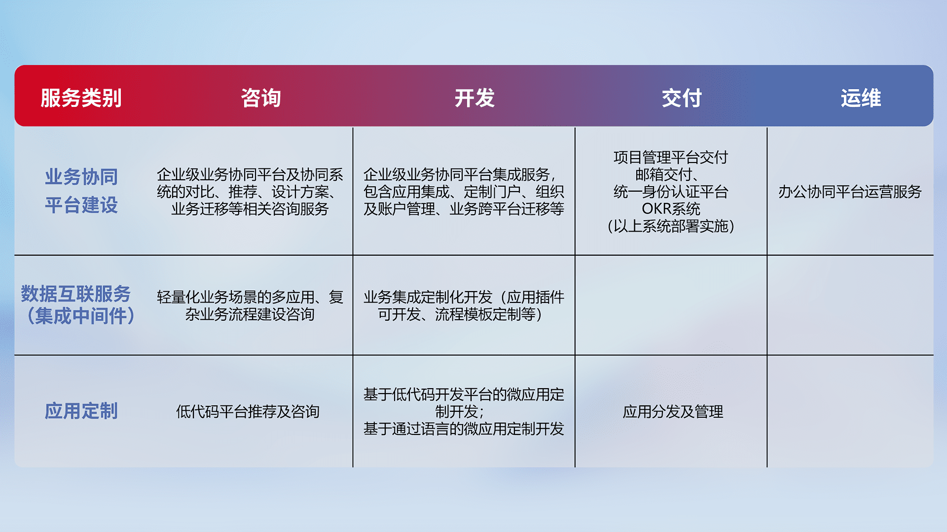 针对钉钉、、、、企微、、、IDaas等平台级产品提供产品的规划、、、、方案、、交付、、、、定制化开发等服务,,实现如统一协同办公、、、、智能客户服务、、混合会议管理、、、、智能数据查询、、等业务场景,,,,实现数字化转型。。。。